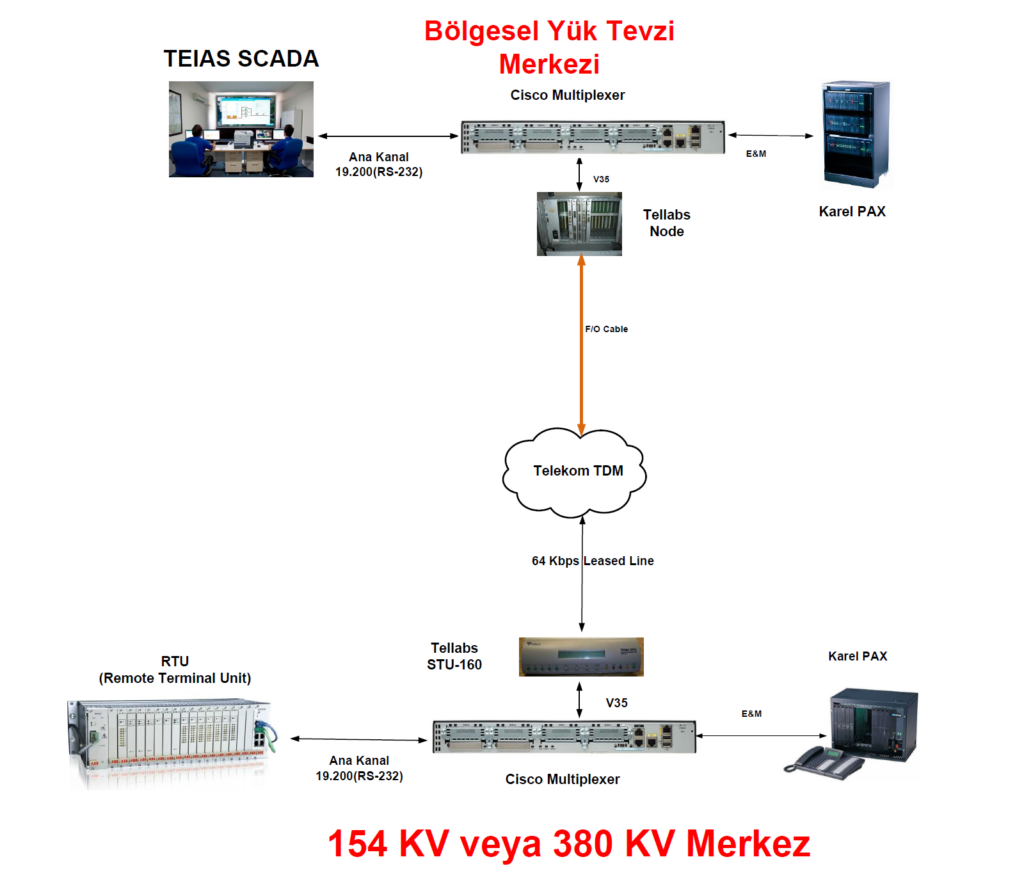 La solution c’est la ligne louée à Türk Telekom à une vitesse de 64 Kbps que TEİAŞ a demandé comme lien de communication principal dans les centrales électriques connectées à 154 KV et 380 KV. La ligne de location à 64 Kbit/s permet 1 transmission de données RTU à 19 200 kbit/s et 2 transmissions téléphoniques E&M PAX. Les lignes de location à 64 Kbit/s sont louées sur le réseau Tellabs TDM de Türk Telekom et 1 modem Tellabs STU-160 est installé chez le client. En contre partie le centre de répartition des charges TEIAS dispose d’un Tellabs Basic Node et une connexion est assurée avec 1 câble V.35 à partir de la carte V.35 installée sur ce Node.
